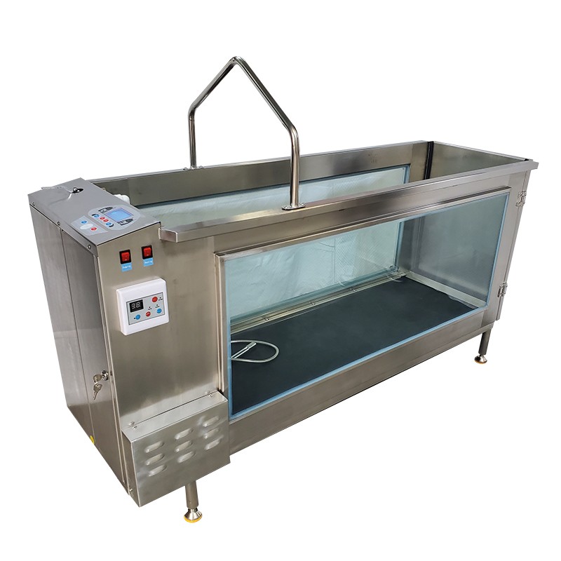 On order only: contact us on 02 46 65 51 21 for delivery time. Hydrotherapy and rehabilitation bathtub with submerged treadmill with water heating function and speed and running time adjustment. Available in Size S - M - L